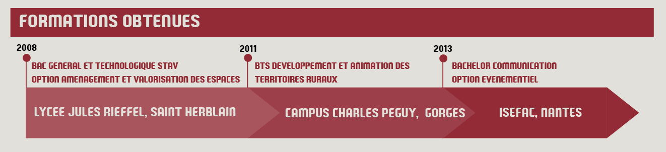 Après obtention de différents diplômes ; Un BAC Science et Technique de l’Agronomie et du Vivant ; un BTS Développement et Animation des Territoires Ruraux et enfin un Bachelor Communication Evènementiel, je suis à présent convaincue et confortée dans le souhait de travailler au sein d’un dans un secteur d’activité me correspondant parfaitement : la communication. En effet, ma curiosité et mon sens du contact sont des qualités qui m’ont permis d’apprendre à développer une écoute attentive.